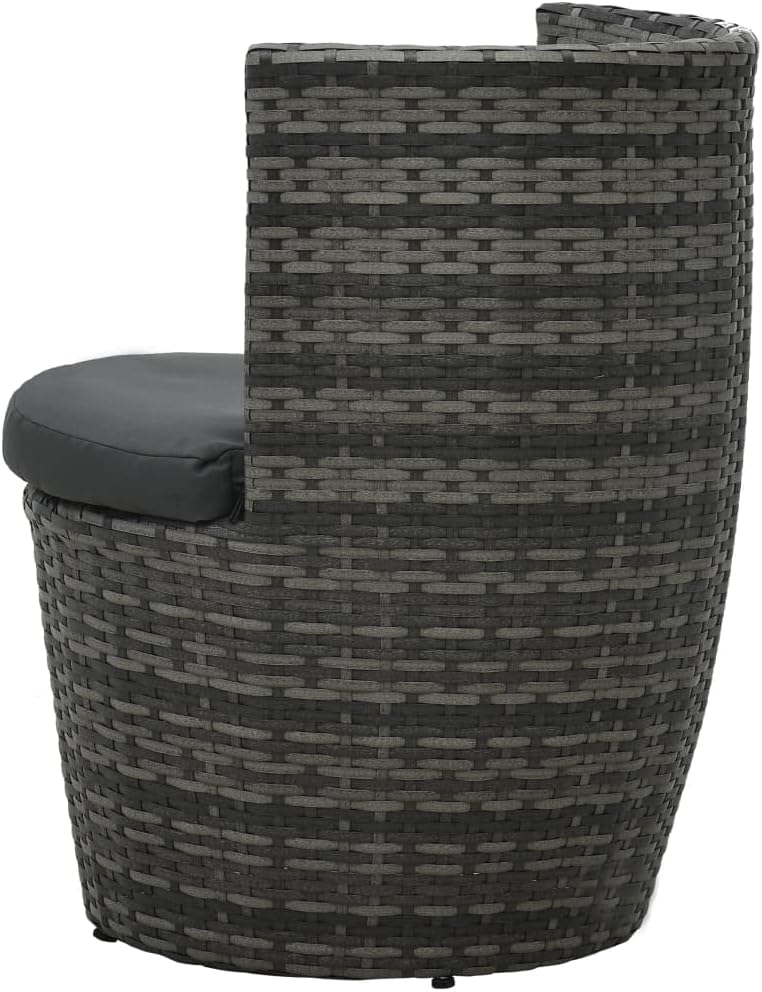 This stylish, functional rattan table and chair set will be a perfect retreat when you want to relax and embrace the sunshine in the garden, on the balcony or on your patio.The bistro set is constructed from sturdy steel and high-quality PE rattan, which makes it durable and easy to maintain. Thanks to the curved backrests and thick, removable cushions, the chairs are very comfortable to sit on. The table has a frosted glass top which is sturdy and easy to clean. Since the rattan set is light in weight, all items are easy to move. Four adjustable feet can be added to each item if needed. Thanks to the clever design, the table and chairs can be stacked to form a compact unit for easy and clutter-free storage.Delivery includes 1 table and 2 chairs (including 2 seat cushions). Note: We recommend covering the garden set in the rain, snow or frost.Color: Gray rattan + anthracite cushion + balck tabletopMaterial: PE rattan + steel frame + glass tabletopCushion material: 100% polyesterChair Dimension: 19,5" x 20,5" x 27,2" (W x D x H)Seat height (measured without cushion): 13,2"Table Dimension: 16,5" x 21,1" (Diameter x H)Cushion thickness: 2"Delivery includes:1 x Table2 x Chair (including 2 seat cushions)