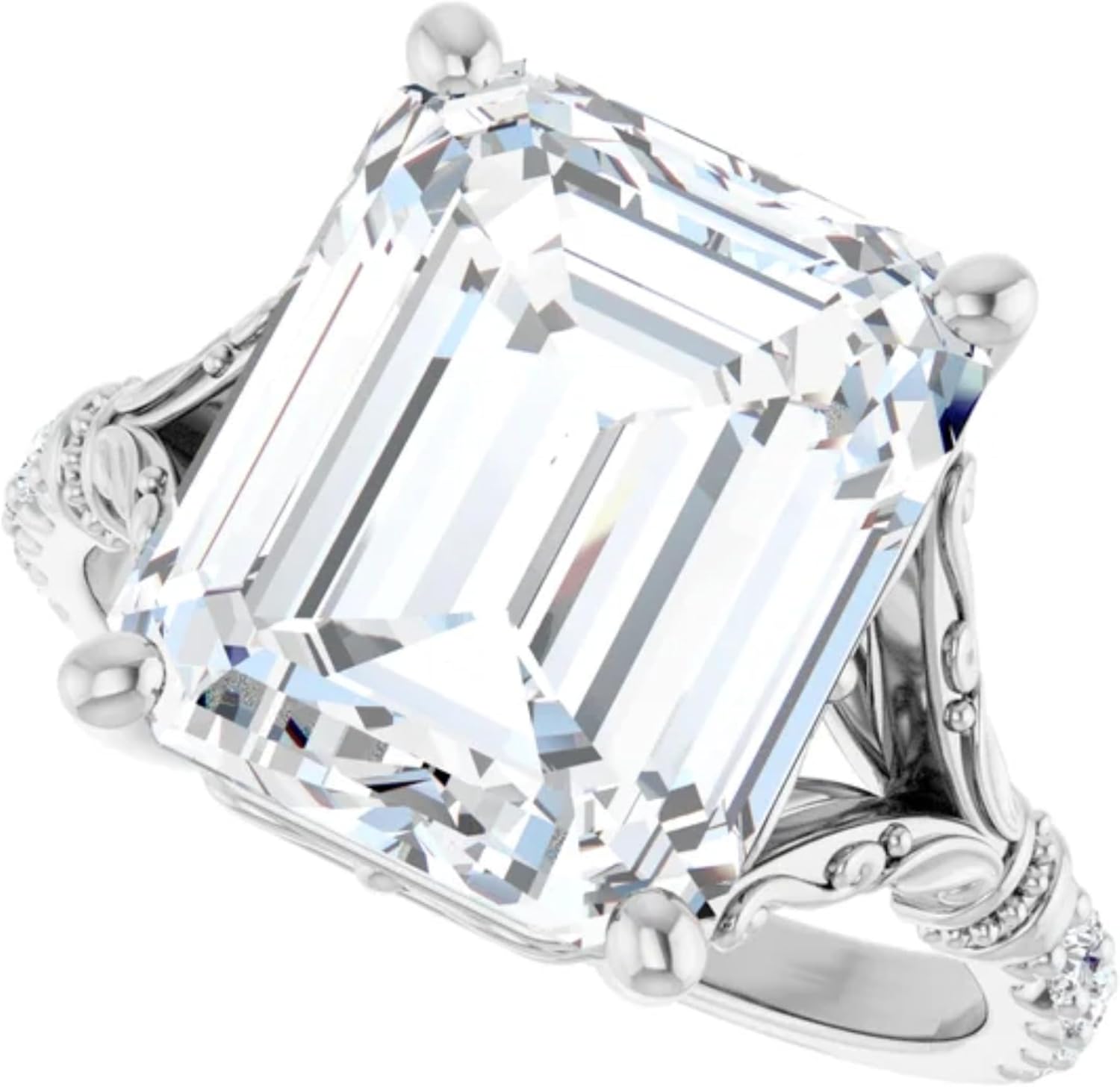 Witness the breathtaking contrast in this vintage-style solitaire. The centerpiece is a magnificent shimmering emerald lab-grown diamond, whose wide, clean facets offer a sophisticated flash of light that represents clarity and modern ethical standards. This brilliance rests atop a band transformed by artistry: intricate scrolls and leaves intertwine fluidly, given a rich, antique patina by precise milgrain edging. With additional sparkle provided by embedded accent diamonds, this ring is a bold, beautiful, and deeply textured statement piece.
