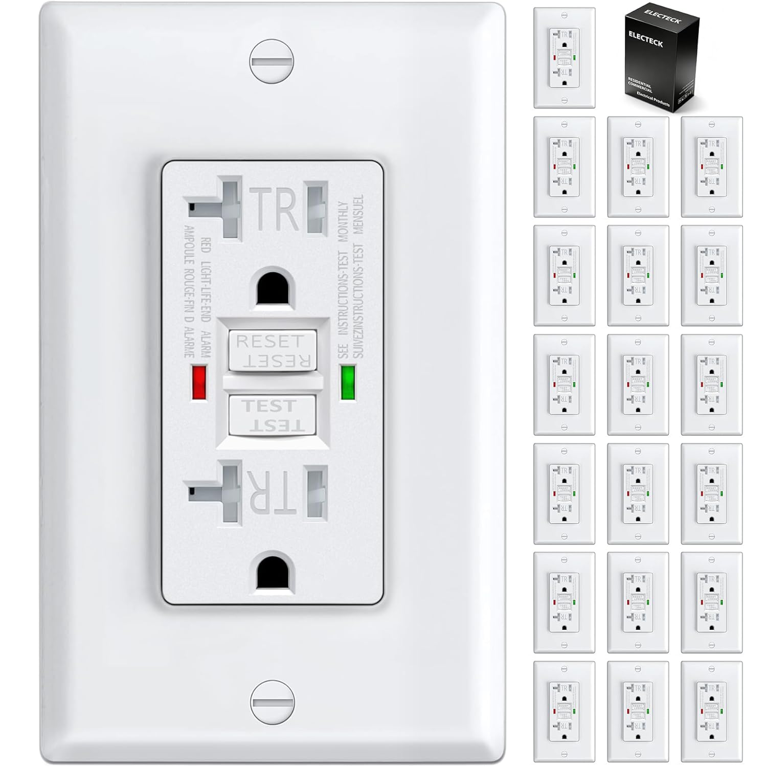 10 Pack - ELECTECK 20 Amp Self-Test GFCI Outlets, Outdoor Weather Proof (WR) GFI Receptacles with LED Indicator, Ground Fault Circuit Interrupter, Screwless Wallplate Included, UL Listed, White. GFCI:GFCI stands for Ground Fault Circuit Interrupter. A GFCI receptacle is different from a conventional receptacle.It has a safety feature that will trip and shut off power within milliseconds of detecting a ground fault, thus helps to protect against electrical shock. Certified:ELECTECK GFCIs are UL Listed, which assures quality and meets specific electrical code compliance. Quality:Each unit of ELECTECK GFCI outlets are individually tested to close tolerances for function and safety before leaving the factory.Customers can trust ELECTECK GFCI to protect your home and family.Advanced Technology:These GFCI receptacles use the latest technology to consistently ensure exact tolerances for trip threshold. This ensures safety, reliability, and eliminates false tripping.Weather ProofMade with special ultraviolet stable thermoplastic to prevent discoloration.Tamper Resistant:These GFCIs feature tamper resistant outlets for where code requires, or for an extra margin of safety.Please note: Tamper resistant receptacles have a safety gate in the outlet to prevent unwanted objects being inserted.The outlet can be a bit difficult to plug into the first few times. This will become easier with multiple use. Screwless Wall Plate and Screws are Included:The included high quality screwless wall plate and screws conveniently save you time and money on your GFCI installation.